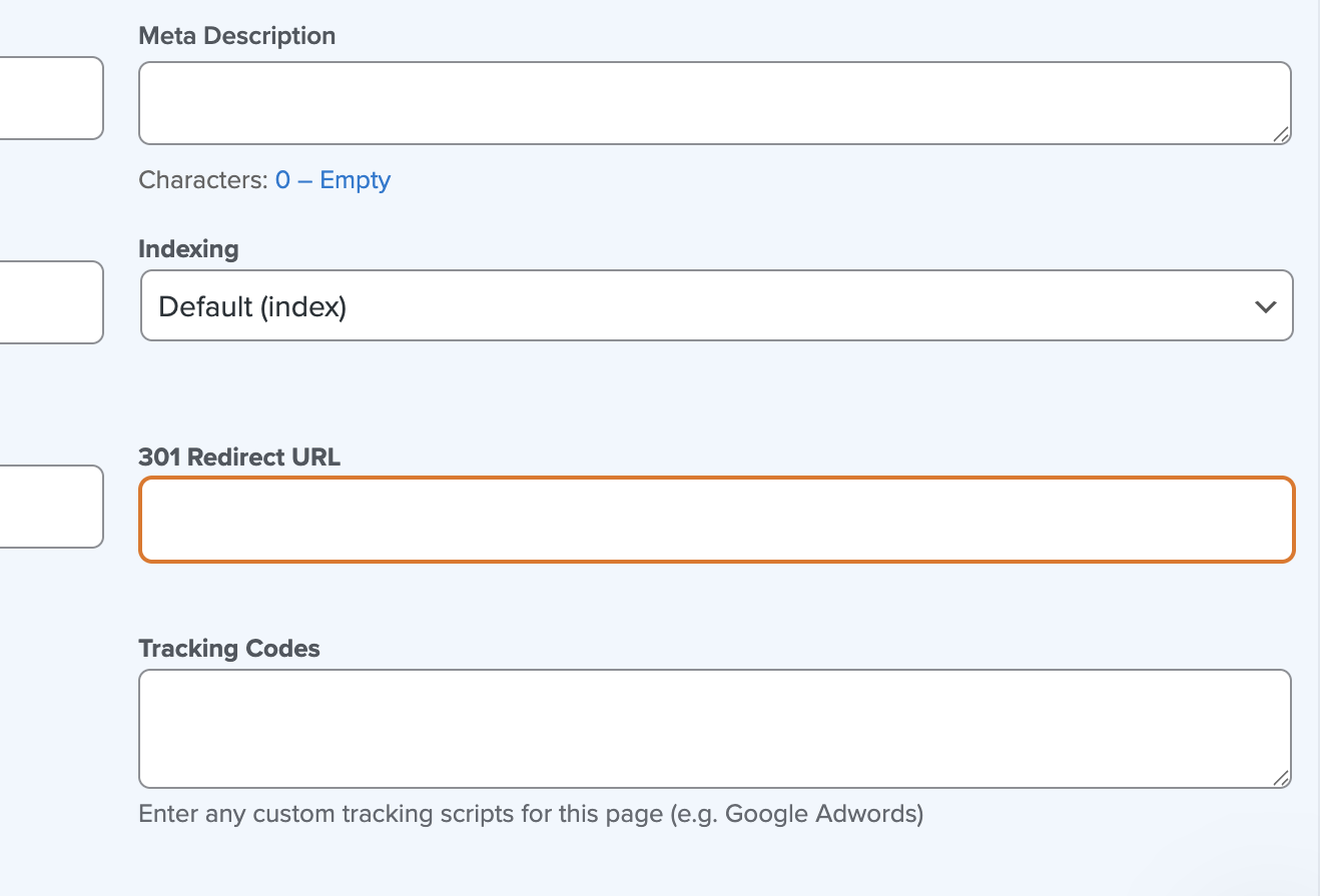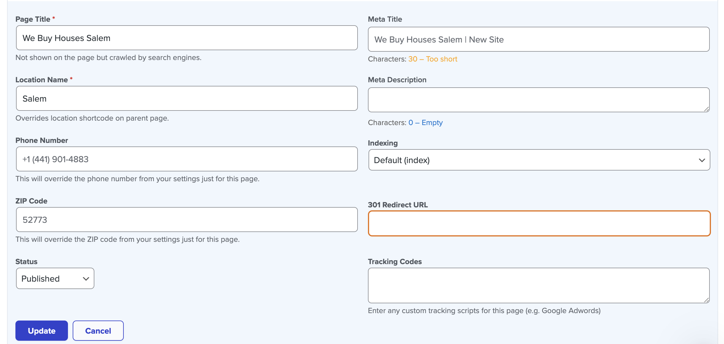 - If you DO have backlinks pointing to the original Location pages, make sure to create a 301 redirect in the SEO menu within the Visual Editor (under “Visibility” tab) and point it to the new auto location page URL. It’s vitally important to NOT set the redirected page to ‘no-index’ or draft after creating the 301 redirect. Search engine crawlers will read the ‘no-index’ or draft mode first and never make it to the 301 redirect.