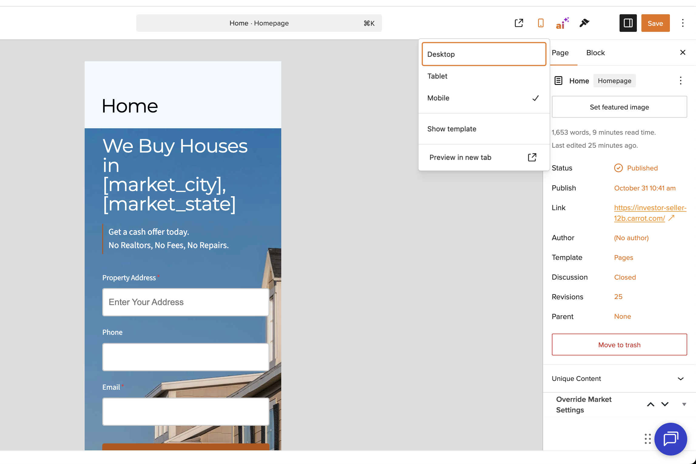 You can now switch your editing view directly inside the Carrot Editor to see how your page looks on: