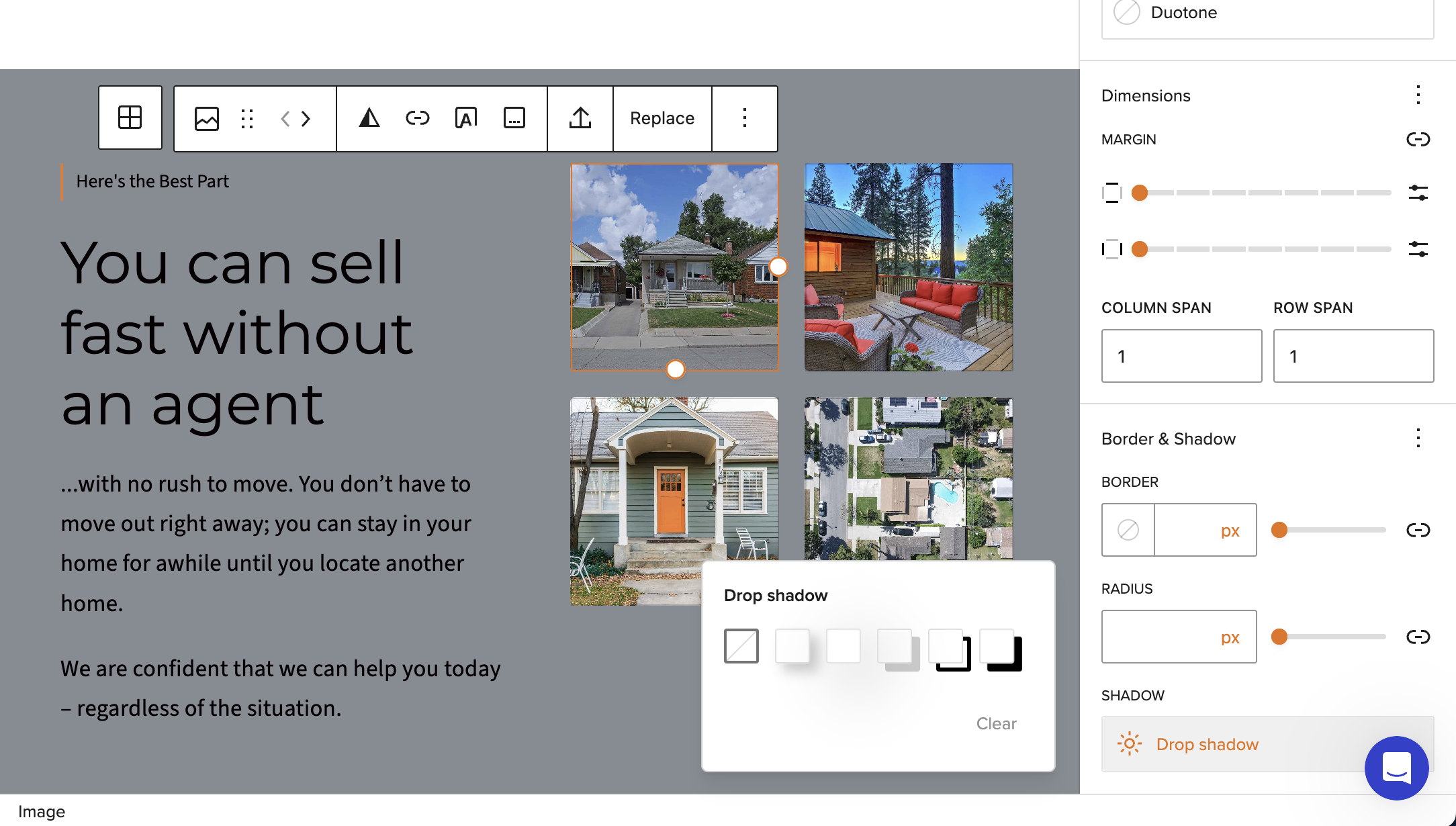 Drop shadow styling helps sections stand out visually and give your pages more depth without custom code. Most blocks now include optional drop shadow settings.
