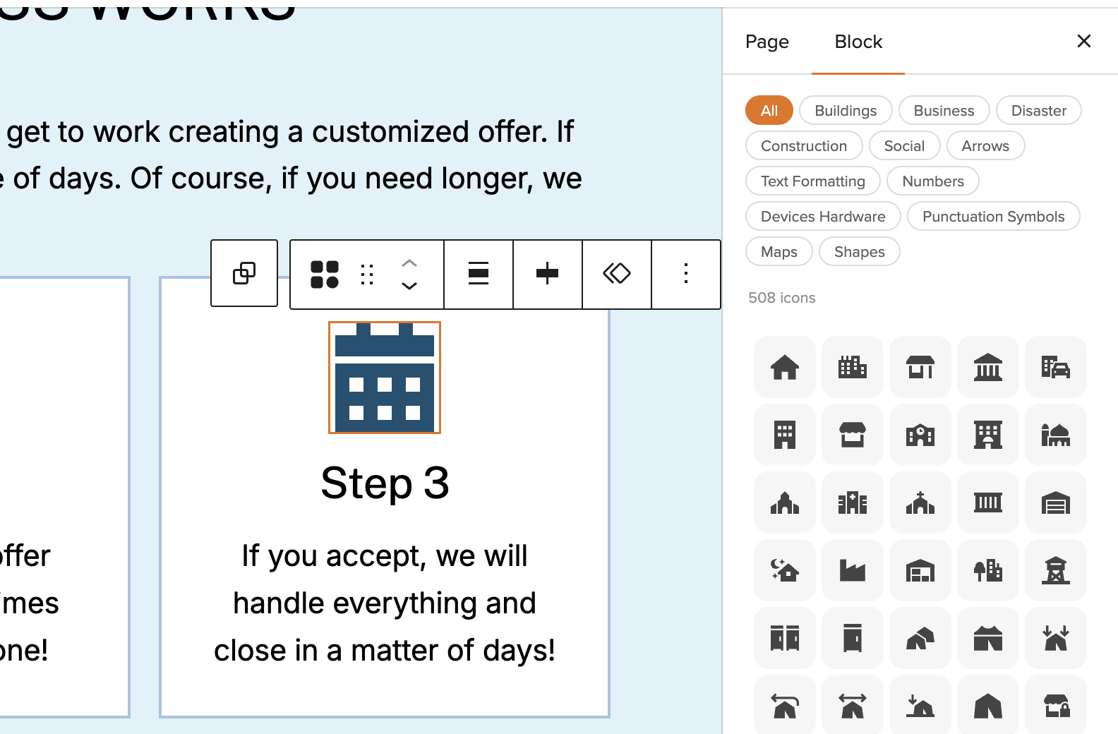 Once you’ve found the icon you want, click it to insert it into your block.