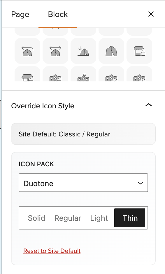 Instead of styling each icon individually, you can set a default style that applies to every Icon block on your site. Any block that hasn’t been manually overridden will update automatically when you change this setting.