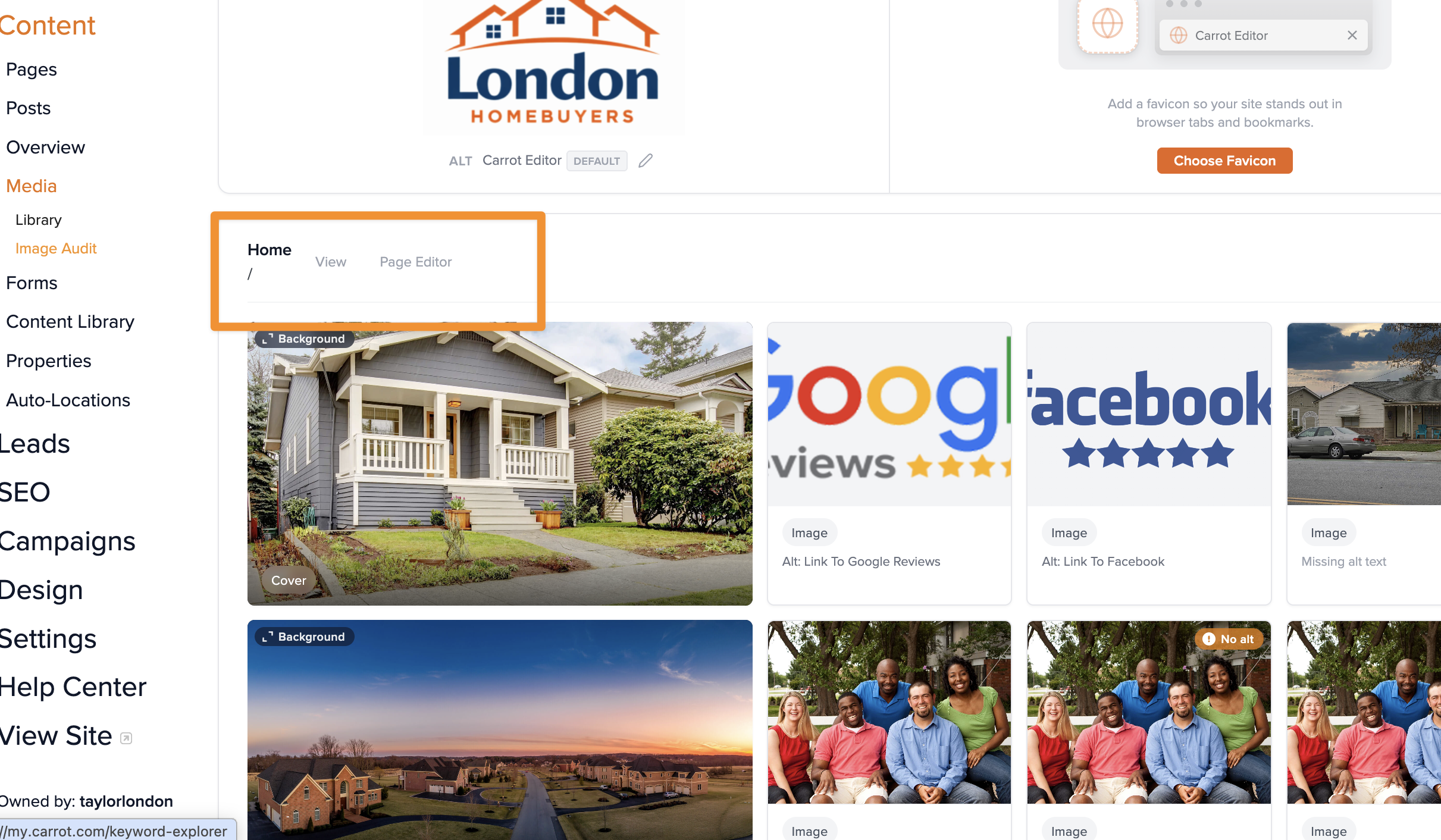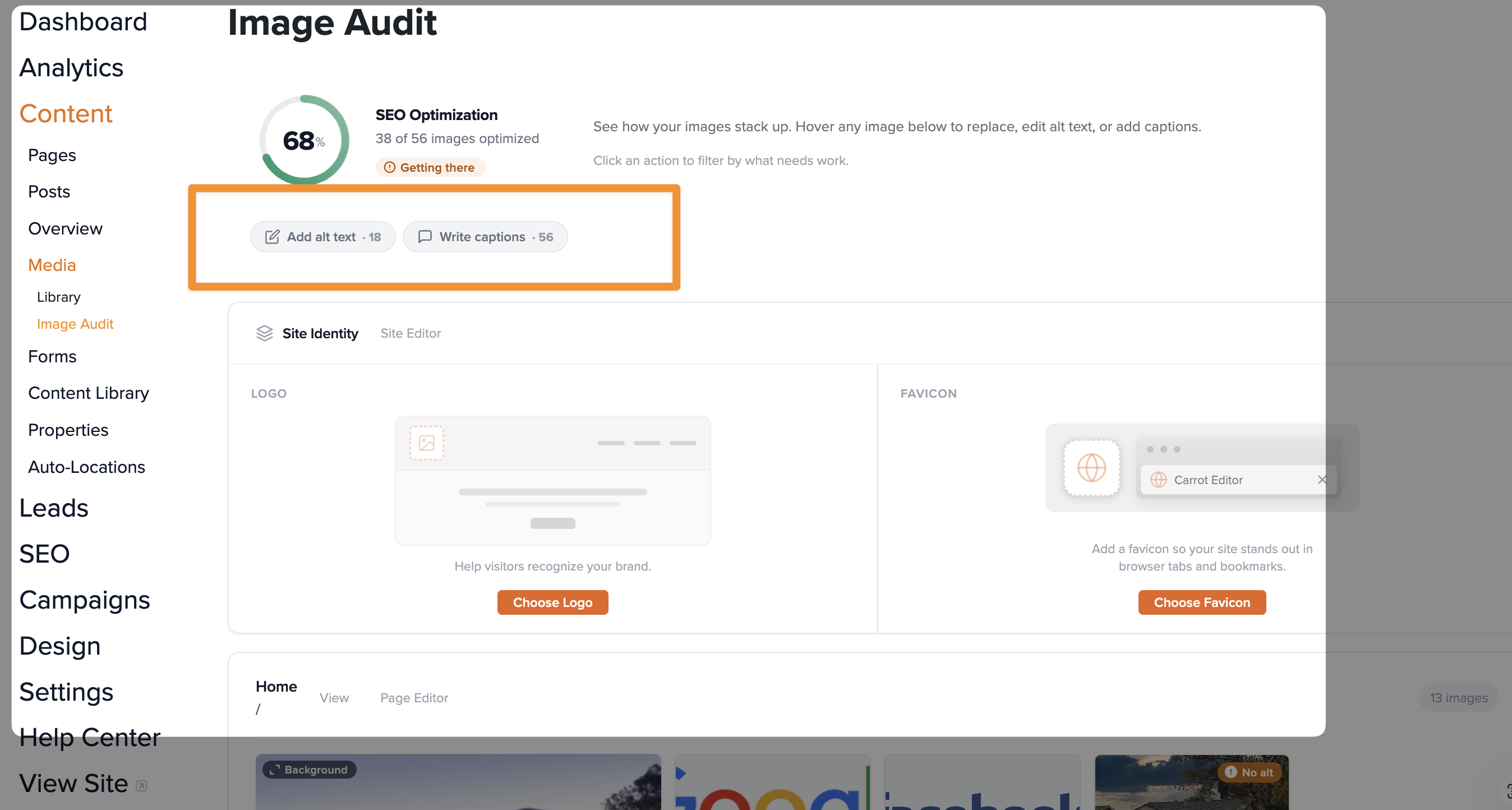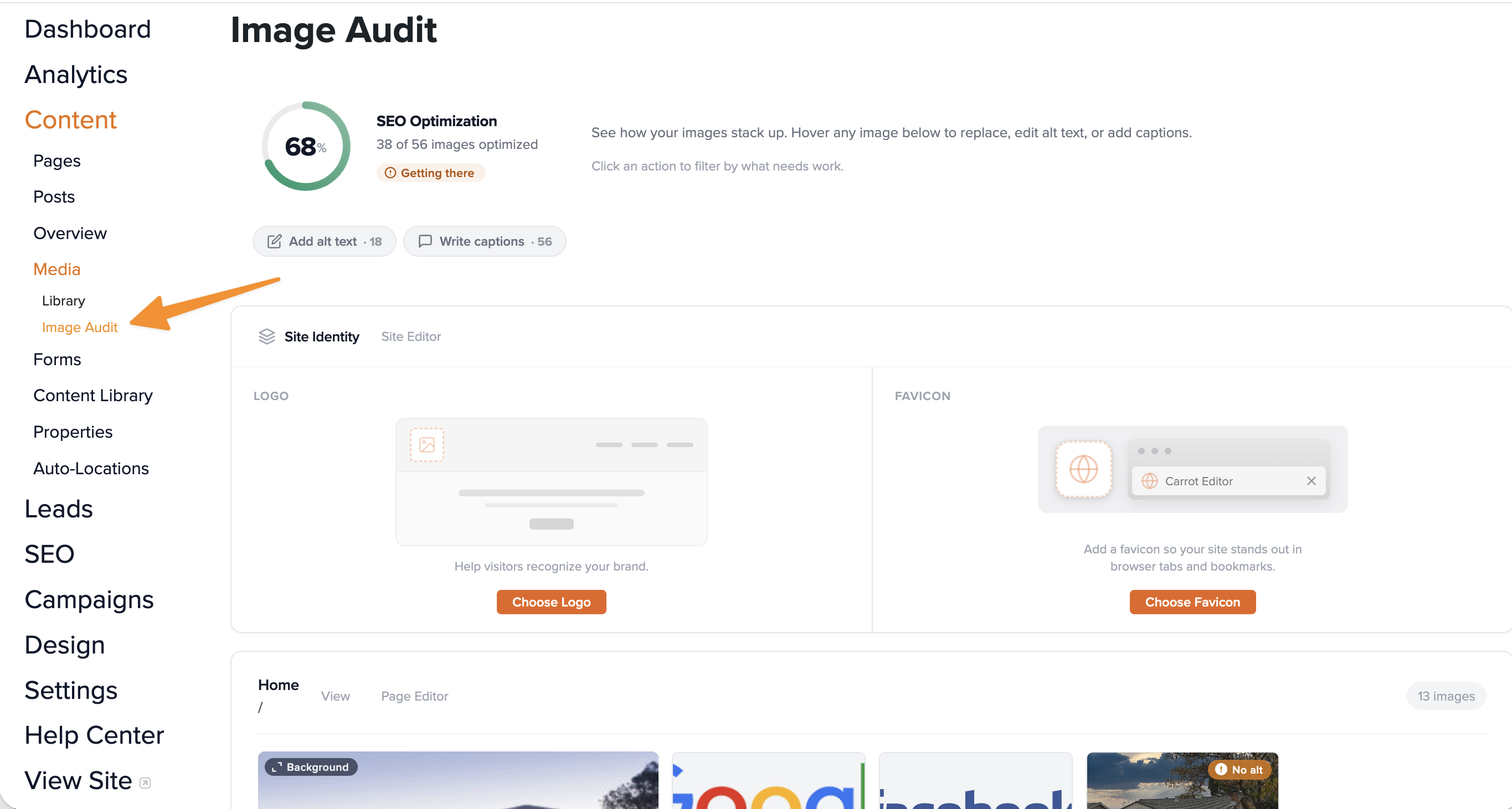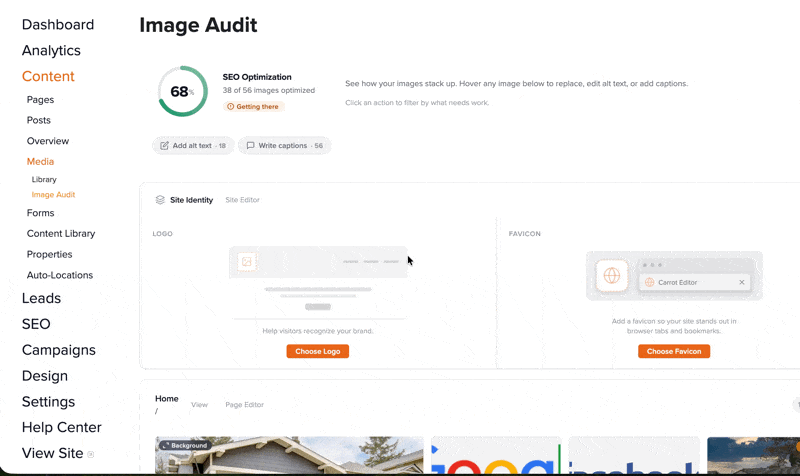 The Image Audit tool gives you one central place to manage every image across your entire Carrot website — replacing photos, adding alt text for SEO, writing captions, and uploading your site branding. Instead of opening each page individually, you can review and update everything from a single view