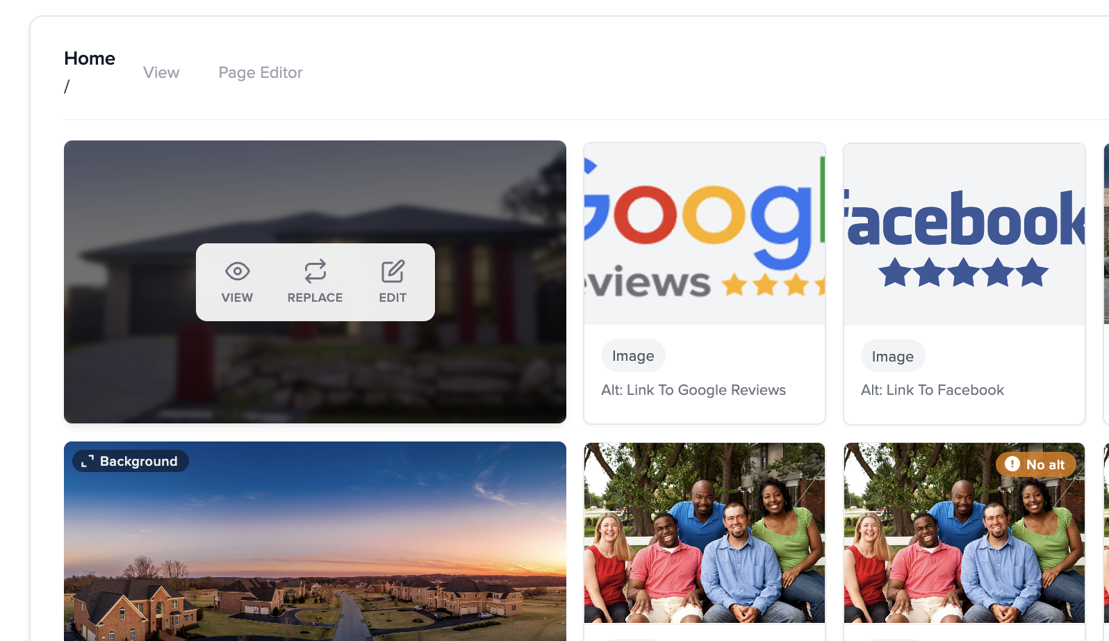 💡 Bonus: While viewing your live site in the editor, you may notice a small overlay icon on images. Hover and click Replace Background to change an image and add alt text without leaving the page view.