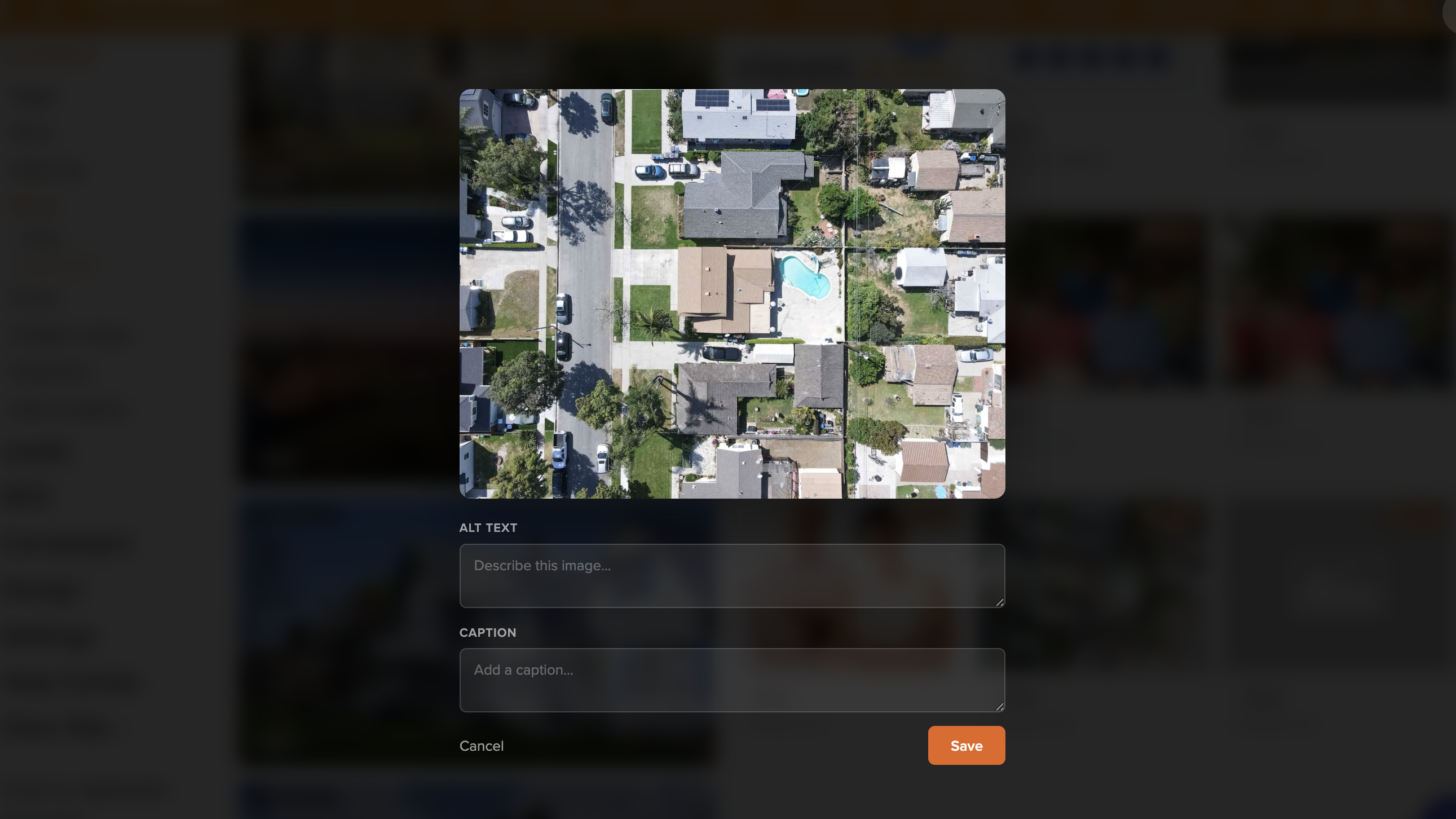 - Describe what’s actually in the image (e.g., “Aerial view of suburban neighborhood in Dallas, TX”)