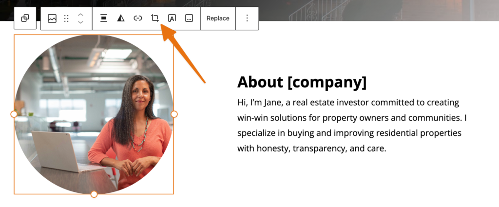 Our built-in cropping tool is handy for polishing headshots and creating clean layouts in seconds. It works when inserting new images or when replacing images in a Block Pattern.